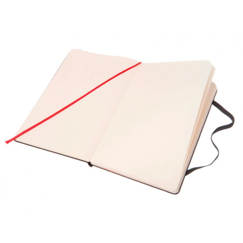 Tapa dura, esquinas redondeadas, bolsillo interno expandible en cartón y tela. Papel de color marfil de 70 g/m² y libre de cloro. Cierre de elástico, marcador de cinta y tela del bolsillo interior del mismo color de las tapas. Contiene 240 páginas