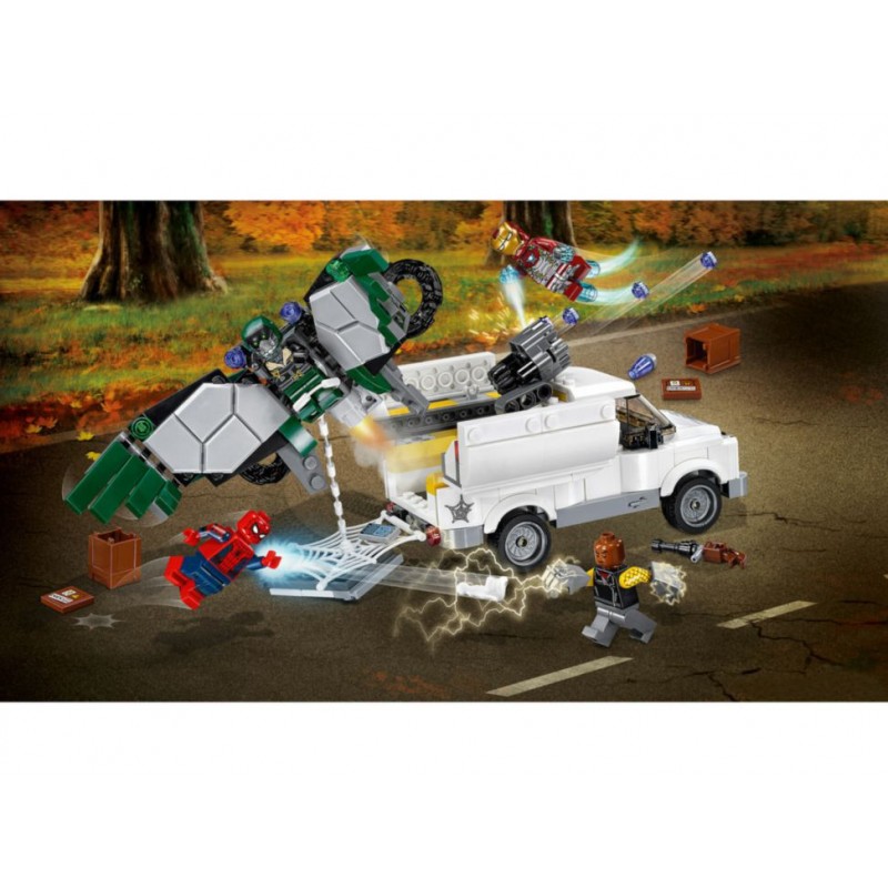 ¡Emergencia! Llama a Spider-Man a su smartphone y pídele que ayude a Iron Man a perseguir la camioneta de The Shocker. Esquiva el cañón rápido de 6 proyectiles de la camioneta y devuelve el fuego con las ráfagas de poder de Spider-Man.