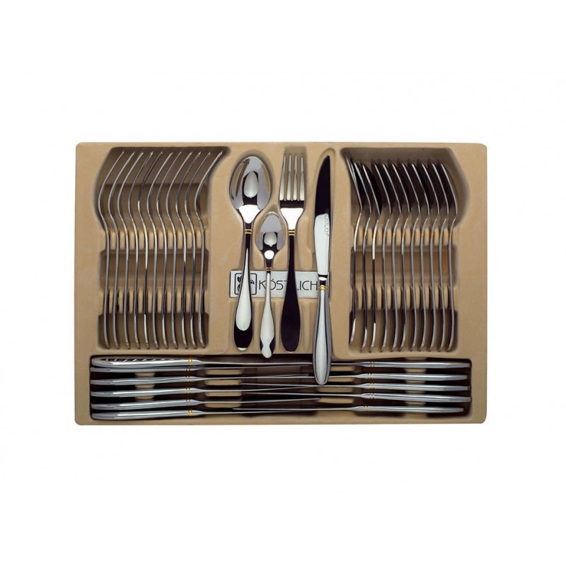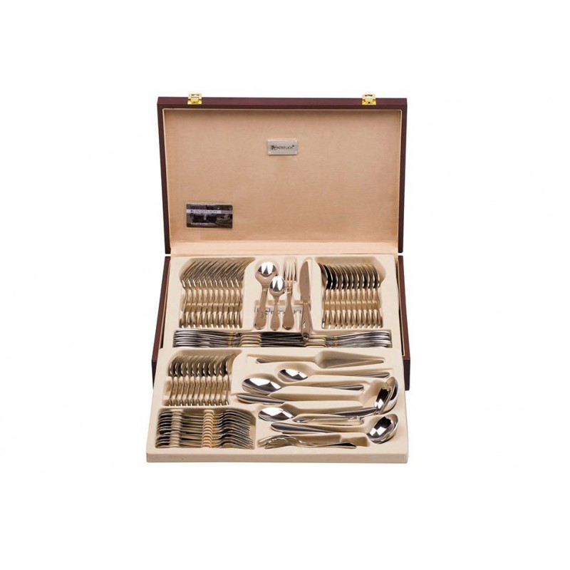 Otra InformaciónJuego de cubiertos para 12 personas, acabado espejo con oro 18k. Estuche en fina madera con barniz al alto brillo con asa, almohada protectora, guantes algodón. Manual de cuidados y certificado autenticidad