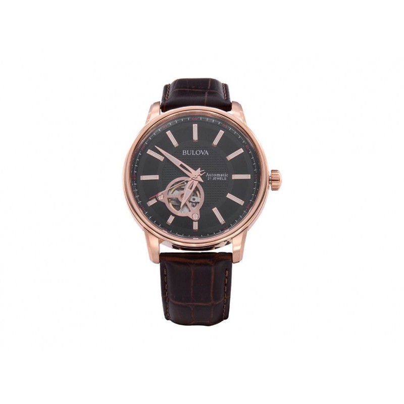 Reloj Bulova Mecánico de cuerda automática. Caja de acero inoxidable. Acabado PVD oro rosa. Carátula negra con apertura. Cristal curvo. Tapa atornillable transparente. Resistencia al agua de hasta 30 metros