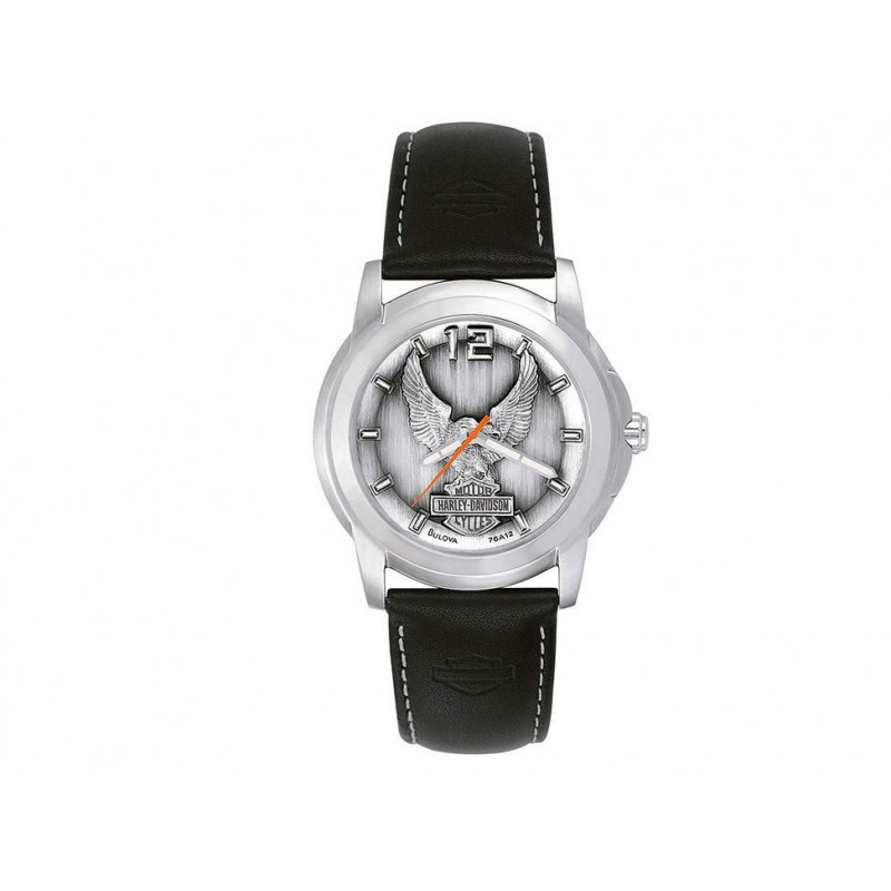 Reloj Harley Davidson para dama. Correa de piel negra. Caja acero inoxidable, diseño en carátula exclusivo de HD, cristal. Resistente al agua 50 metros